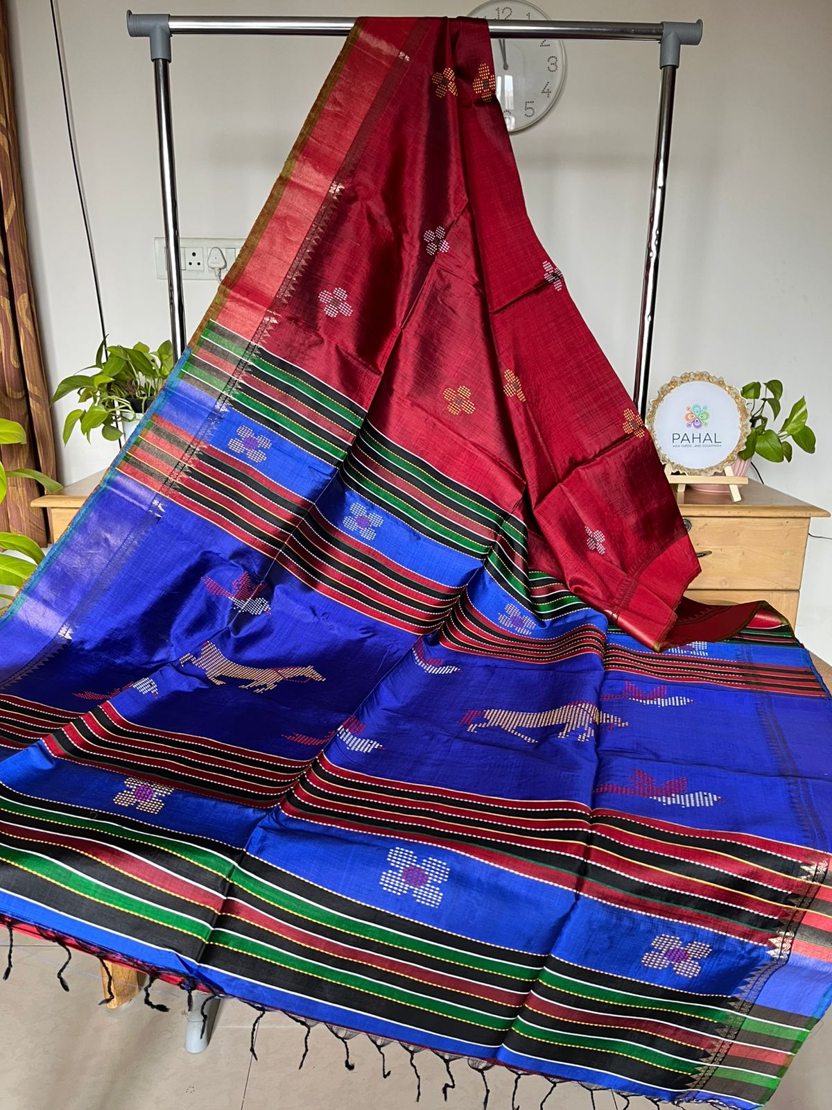 Saree Colour - Maroon body with butas and midnight blue pallu with horse motif