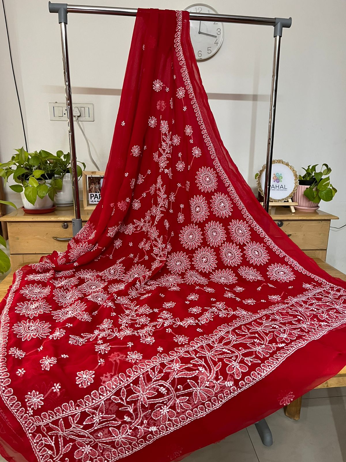 Saree Colour - Bright red with chikankari (butas all over body and heavy chikankari on border and pallu)
