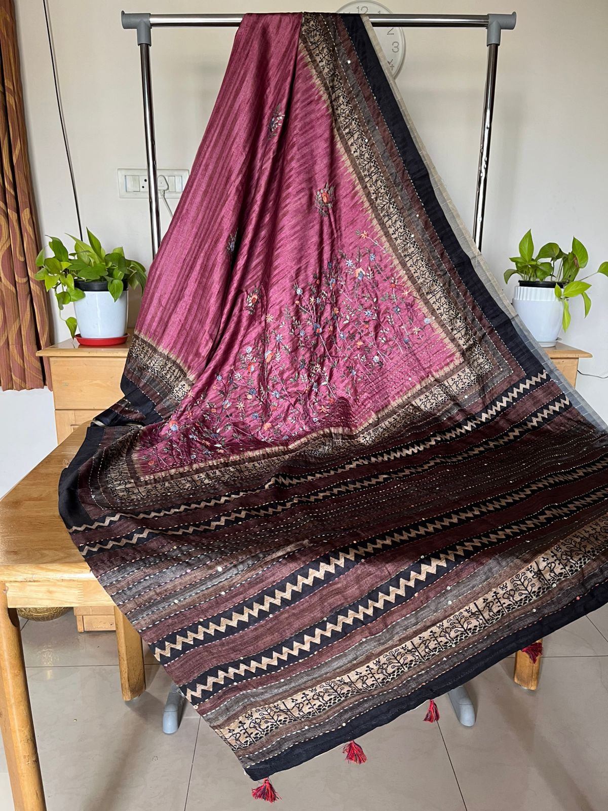 A semi tussar silk saree adorned with intricate bullion stitch embroidery, offering a perfect blend of natural elegance and artisanal charm.