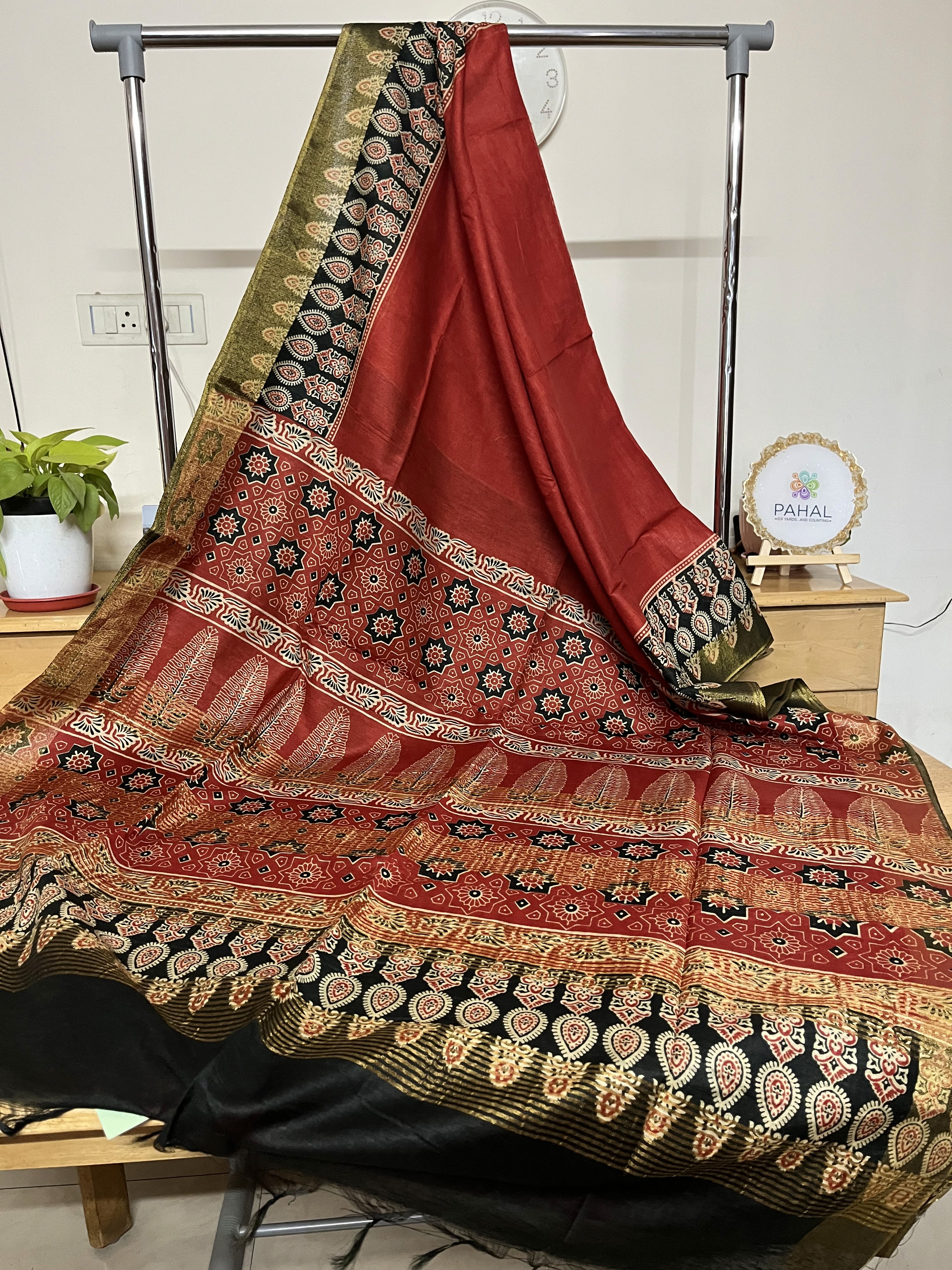 A baapta silk saree featuring exquisite block prints, blending traditional craftsmanship with a refined, luxurious drape.