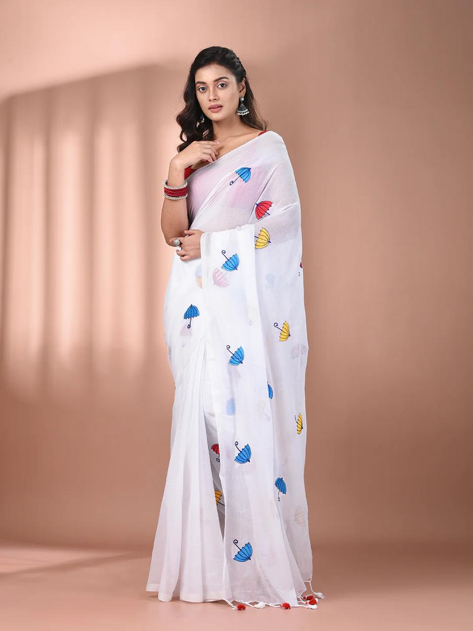 Saree Colour - White body with multicoloured umbrella embroidery all over body