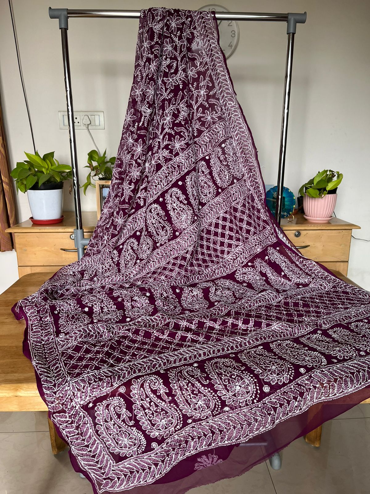 Saree Colour - Wine with chikankari jaal work all over body and border, butas on pleats